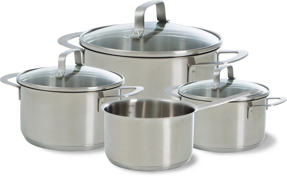 De gesatineerde roestvrij edelstalen body loopt loodrecht omhoog en mondt uit in een strakke rand. Door deze schenkrand kun je eenvoudig vloeistoffen afgieten. De strak afgeronde grepen en stelen zijn vuurvast, liggen prettig in de hand en zorgen voor een veilige grip tijdens het koken.