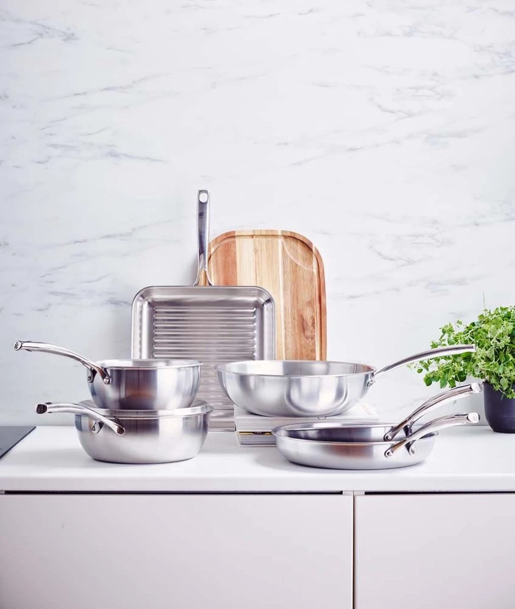 De BK Superior 3-ply pannen zijn een must have voor iedere hobbykok. De pannen zijn geheel vervaardigd uit 3-ply, een unieke constructie van twee lagen roestvrij edelstaal met een laag aluminium ertussen. Deze constructie zorgt voor een snelle en gelijkmatige warmteverdeling zonder hotspots. Ideaal voor het op hoge temperatuur aanbraden van bijvoorbeeld biefstuk. De sierlijke hol gegoten greep ligt lekker in de hand en wordt minder snel warm tijdens het bakken. Door de combinatie van materialen heb je met de BK Superior pannen jarenlang bakplezier. De hoogglans body blijft mooi vanwege de Evershine technologie, door deze technologie is uw pan beschermd tegen hitteverkleuring en blijft deze als nieuw. De BK Superior 3-ply pannen zijn geschikt voor alle warmtebronnen, inclusief inductie en kunnen in de oven. Na gebruik reinig je de pannen eenvoudig in de vaatwasmachine.